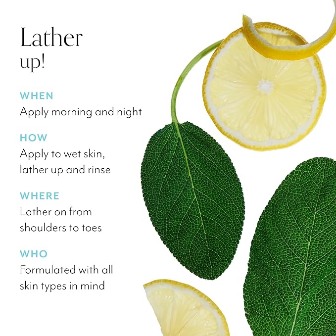 • HOW TO APPLY: Apply to wet skin, lather up and rinse. Follow with Lemon & Sage Body Butter for the ultimate experience.
