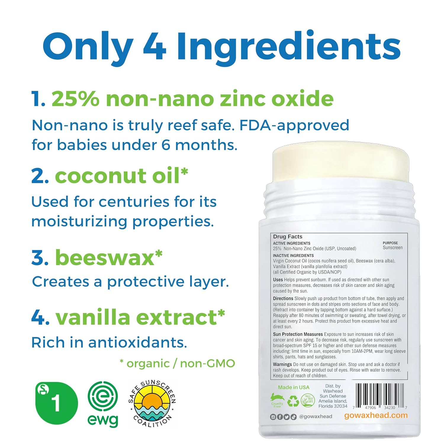Waxhead Zinc Oxide Sunscreen Stick SPF 30 – Mineral Sunblock for Face & Body, Sport & Surf Reef Safe, Waterproof, Baby & Kids Safe for Sensitive Skin, Non-Nano Organic Tattoo Protection (White, 3.7oz)