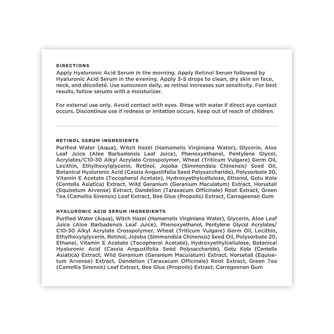 - EASY TO USE INSTRUCTIONS: Morning routine begins with applying the Hyaluronic Acid Serum to face, neck, and décolleté for hydration. In the evening, first use the Retinol Serum then follow with the Hyaluronic Acid Serum on clean, dry skin for enhanced rejuvenation. Dispense 3-5 drops for each application. Incorporate daily sunscreen use to protect against increased sun sensitivity due to retinol