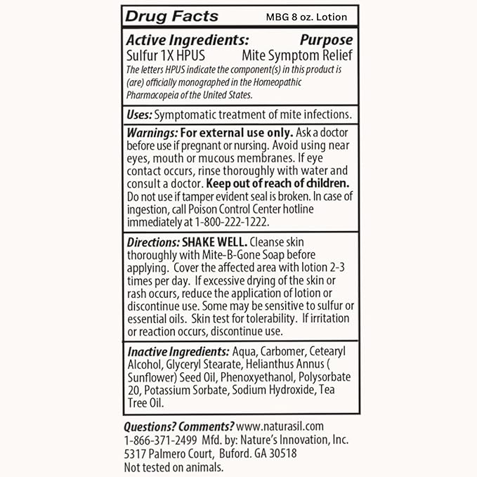 - Product Benefits : Mite-B-Gone's lotion is a 100% Natural Formula that includes Sunflower Seed Oil and Tea Tree Oil, a known soothing and anti-inflammatory blend, which works quickly to counteract itching and progressively clear up any discomfort. Mite-B-Gone's lotion is a 100% Natural Formula that includes Sunflower Seed Oil and Tea Tree Oil, a known soothing and anti-inflammatory blend, which works quic… See more