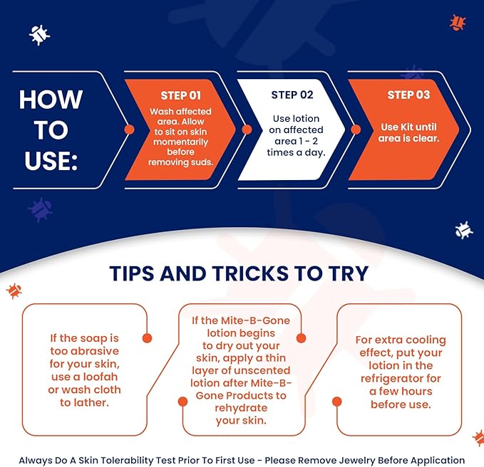 - Mite-B-Gone lotion gives you lasting relief WITHOUT any harsh chemicals or irritation.