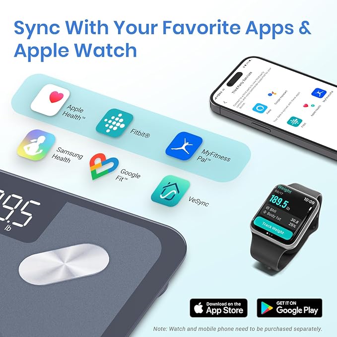 - Use with Ease: Seamlessly integrate our scale into your fitness routine. Compatible with APPLE WATCH and syncs data with popular fitness apps like Apple Health, Samsung Health, Google Fit, FitBit, and MyFitnessPal. Supports unlimited users for convenience