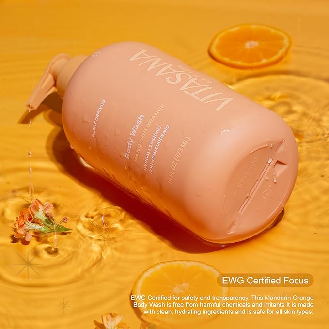 • EWG VERIFIED CLEAN FORMULA – Vitasana Mandarin Orange Body Wash meets the strict safety standards of the EWG Verified program, ensuring it’s free from harmful chemicals like parabens, sulfates, phthalates, petroleum, artificial dyes, synthetic fragrance, nickel, soy, and lanolin. One of fewer than 2,500 products globally to earn this distinction—clean skincare you can trust.
