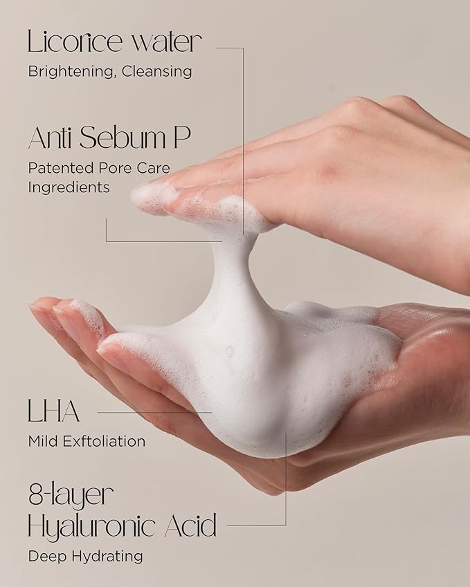- KEY INGREDIENTS FOR OPTIMAL SKIN HEALTH: Enriched with licorice water for tone care, anti-sebum P for pore care, LHA for non-irritating exfoliation, and 8-fold hyaluronic acid for deep moisturization, this gel foam cleanser addresses various skin concerns, leaving your face vibrant and healthy-looking.