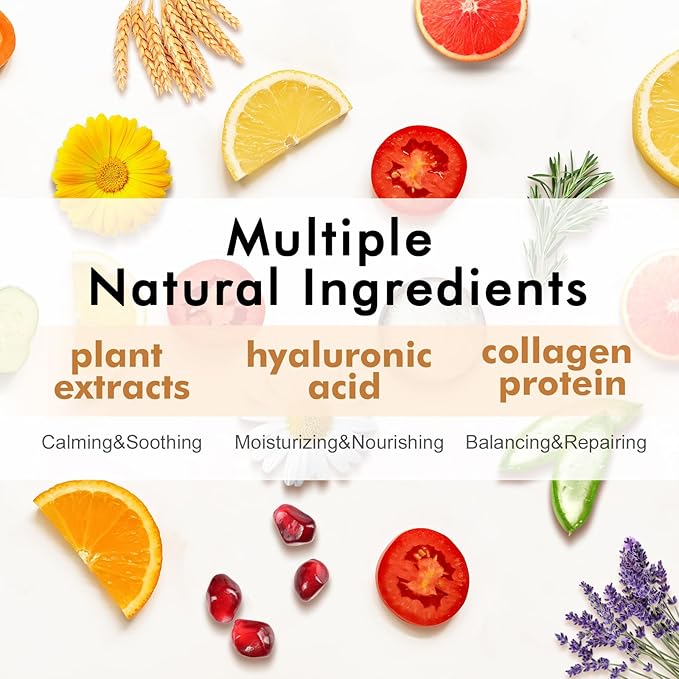 - 【70 Pack Face Mask Gift Set】Our facial sheet masks skincare with 14 natural ingredients like aloe,pomegranate,honey,tomato,ginseng,lavender,sake,oats,grapefruit,chamomile,hyaluronic acid,vitamin C,tea tree,shea butter.Rich collagen essence can be quickly absorbed by the skin,the skin will feel smoother and younger