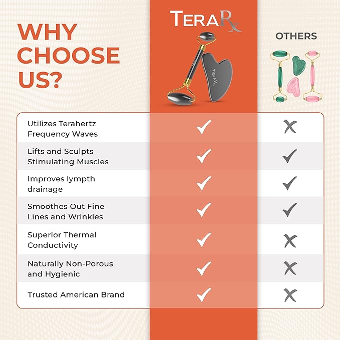 - Terahertz Gua Sha Kit: Our top-selling terahertz tools in one skincare kit! You get the facial gua sha tool and terahertz roller together. The kit is expertly designed to relieve facial tension, reduce the appearance of fine lines, and enhance blood circulation. By gently scraping the skin, it promotes lymphatic drainage and helps detoxify the skin, resulting in a smoother, more radiant complexion.