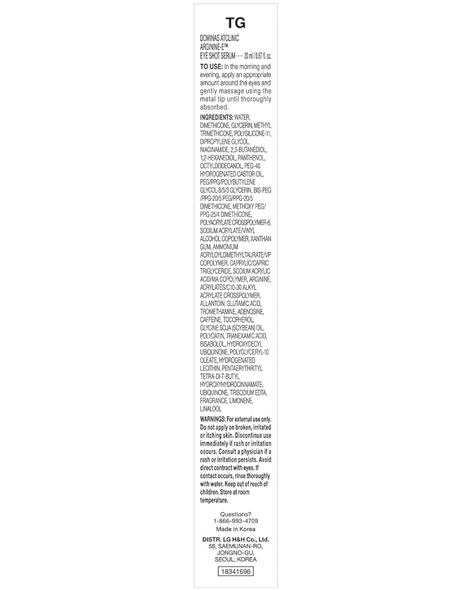 - DOMINAS ATCLINIC ARGININE-E EYE SHOT SERUM (0.67 fl oz) - This advanced eye serum addresses under-eye concerns such as discoloration, puffiness, fine lines, and uneven tone. Formulated with Arginine-E, Polydatin, and other powerful ingredients, it revitalizes and enhances the delicate skin around the eyes for a refreshed appearance.