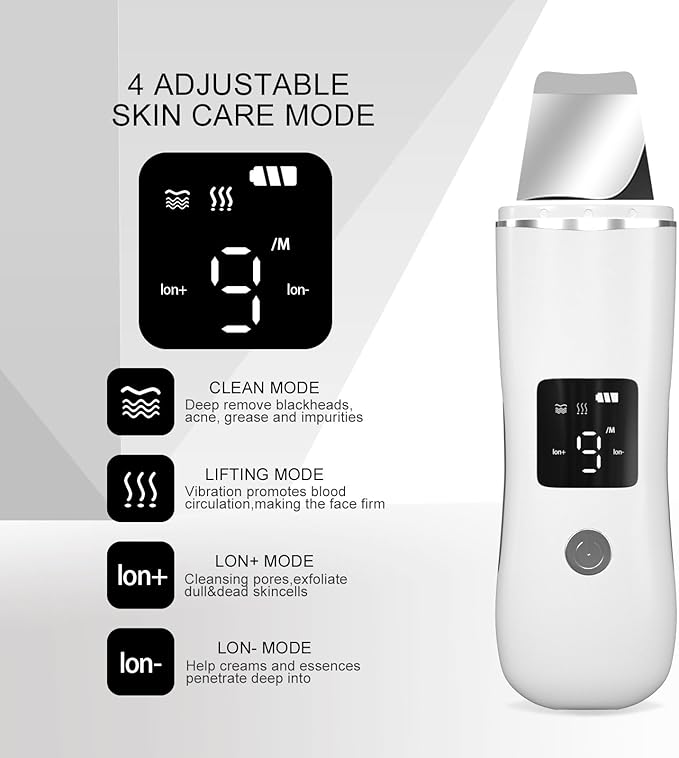 - 4 Modes Skin Spatula - Experience comprehensive skincare with this multifunctional scrubber. Its 3D curved, stainless steel spatula effortlessly navigates your face, even around tricky areas, removing build-up and debris. Simply wet your face and glide the spatula for a spa-like experience.
