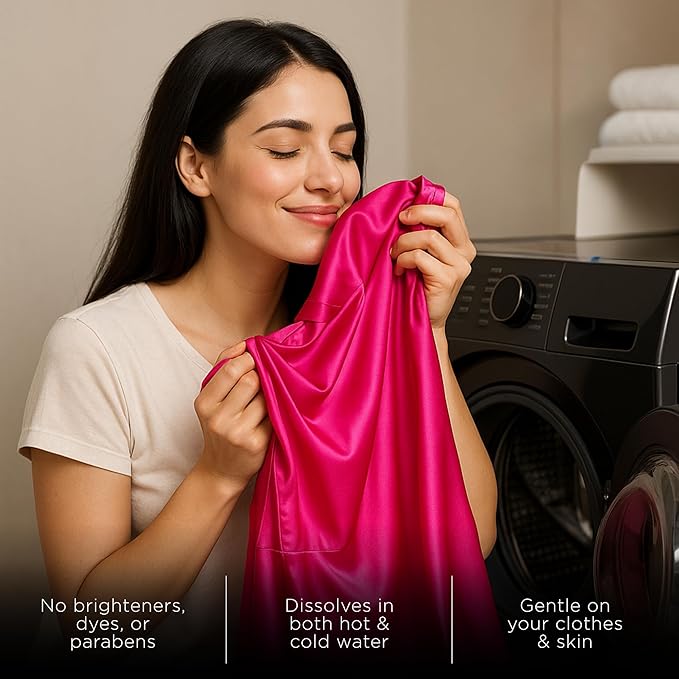 - LUXURY FABRIC CARE & LONG-LASTING SCENT – Treat your clothes with the luxury laundry detergent they deserve, preserving fabric softness while infusing garments with a captivating fragrance that lasts all day. Perfect laundry room essentials, it’s ideal for both delicate items and heavy-duty loads. Whether using in an HE machine or washing by hand, this delicate laundry detergent ensures a premium glamour wash every time—protecting your fabrics and leaving them with a fresh, lingering scent.