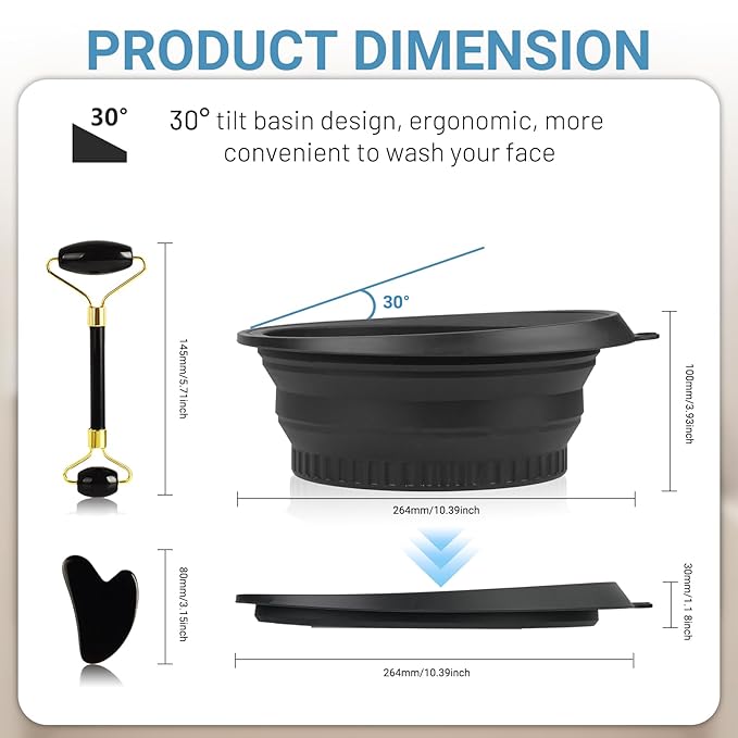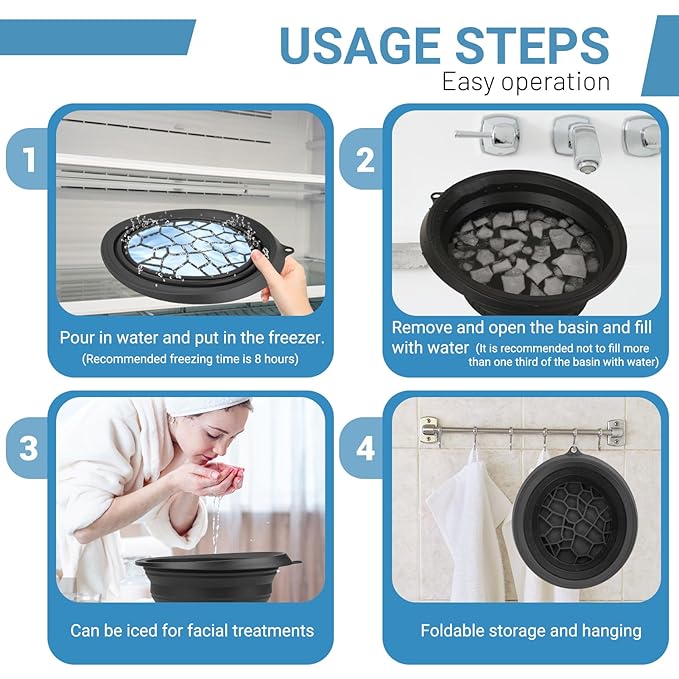 - [Portable Design]: The foldable facial ice bath bowl is made of silicone material, and the seamless folding structure can be flattened to an ultra-thin state of 1.18 inches with a light touch, making it easy to store and worry-free for travel and camping. After unfolding, it becomes a multi-functional container in seconds. With the resin scraping board and facial roller, it is light, resistant to falling and has a warm touch, forming a mobile beauty station that combines professionalism and scene adaptability
