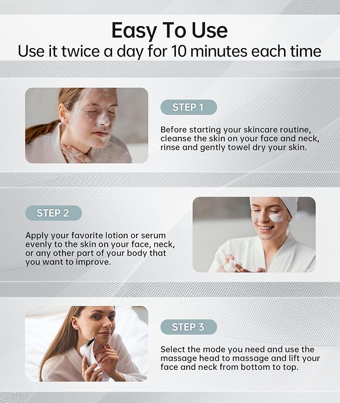- Usage Recommendations: Clean your skin and apply some skincare products before use. Use the face massager tool for face lift from bottom to top. You can double click the button to stop the vibration. It is recommended to use it twice a day for about 10 minutes each time